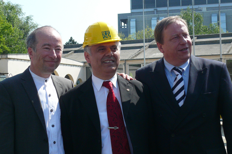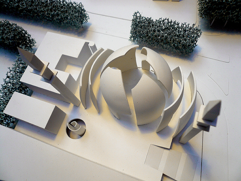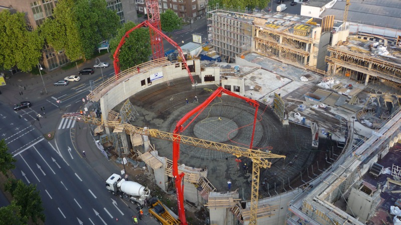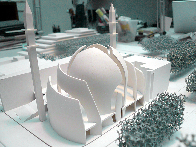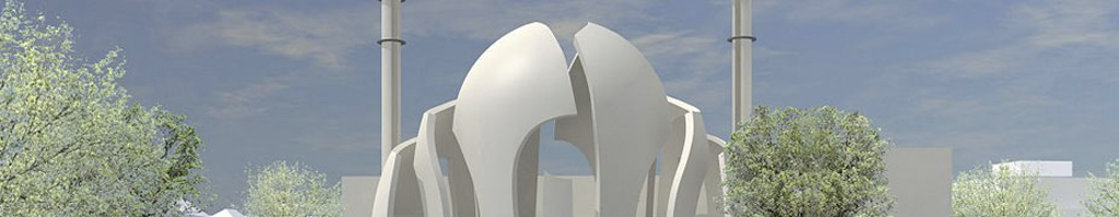 In a neighbourhood near the centre of Cologne, Germany's biggest mosque is about to be built. Construction has started in autumn 2008. Client and financier is the DITIB, the biggest Islamic organization in Germany, representing, according to its own sources, one million of the 2.5 million Muslims living in Germany. The contract for the building, which is expected to seat 3000, was awarded to the famous church architect Gottfried Böhm and his son Paul: a rectangular building will be crowned by an imposing semi-transparent, 27m high dome, whose glass elements will evoke the image of folded, protecting hands. The dome will be flanked by two 55m high minarets.